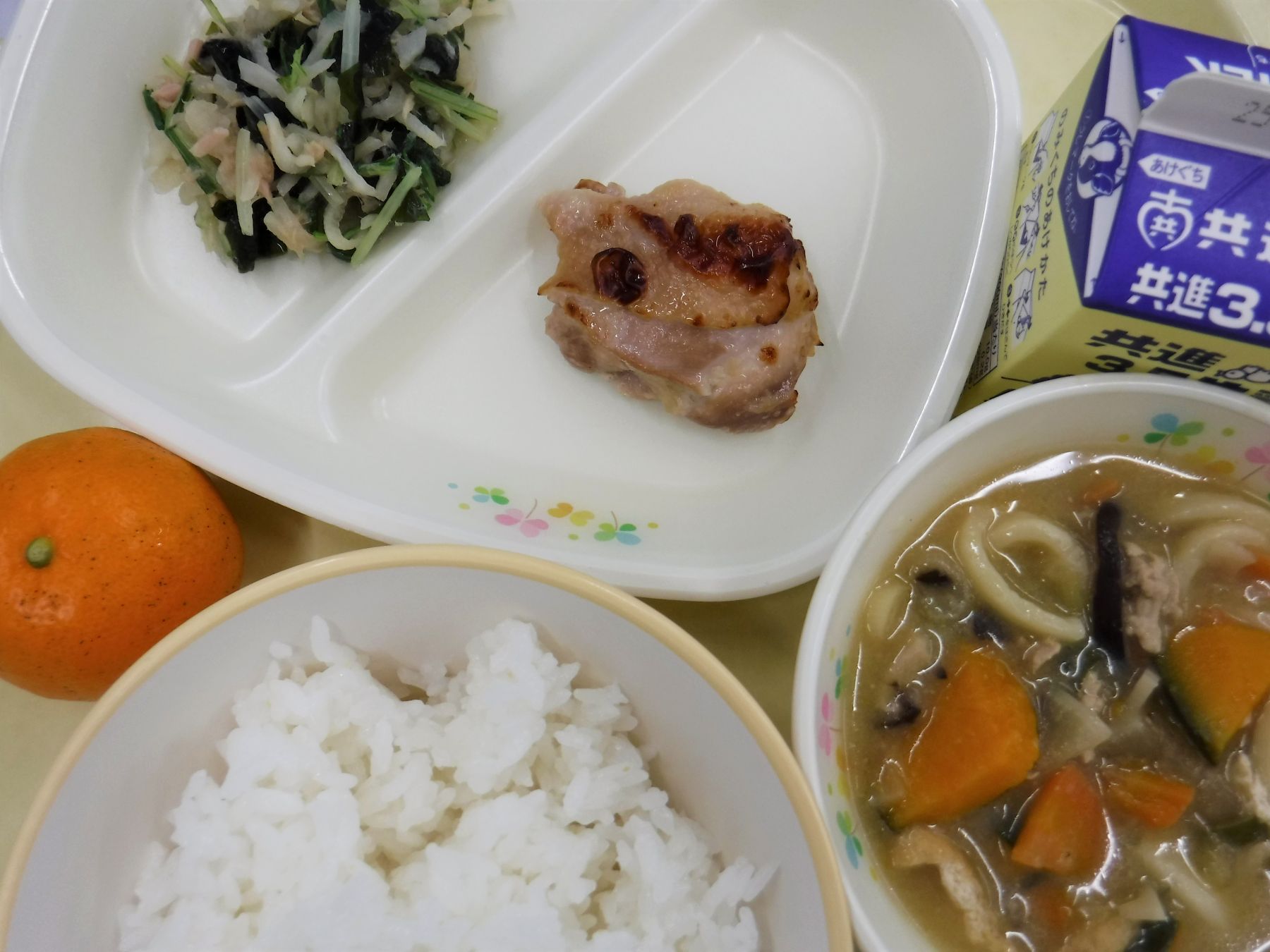 22日は冬至です。1年で最も太陽がでている時間が短く、夜が一番長い日の事です。この日をさかいに、日が再び長くなっていくため、昔の人は太陽の力がよみがえる神秘的な日としていました。日本ではこの日に「運盛り」といって「ん」のつく食べ物を食べ、「運」を呼び込もうという縁起をかつぐ風習があります。それで「ん」が2つもついている南瓜と呼ばれる「かぼちゃ」をよく食べるようになりました。今日は「ん」がついた食材がたくさん入った「冬至うどん」とみかんです。冬至うどんにはどんな食材が入っているか見つけてください。しっかり食べて、運を呼び込んでください。