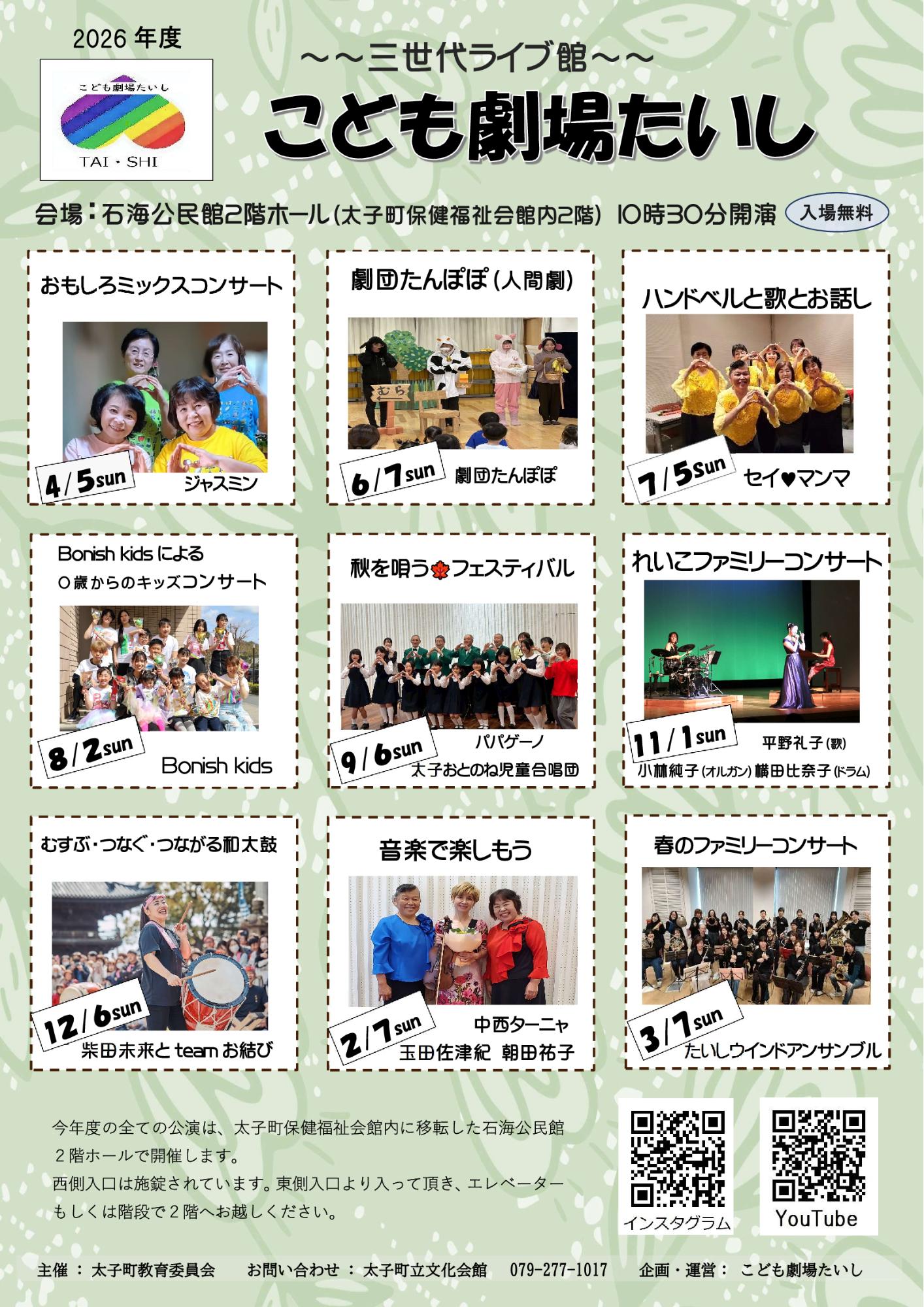 令和8年度こども劇場たいし年間行事予定 会場が変更となっていますので、ご注意ください。 石海公民館2階ホール(保健福祉会館内) 太子町老原102-1 この記事に関するお問い合わせ先 文化会館※大規模改修工事に伴い令和9年3月31日まで事務所を移転します〒671-1592 兵庫県揖保郡太子町鵤280番地1(社会教育課内)電話:079-277-1017 FAX:079-277-2201メールのお問い合わせはこちらから