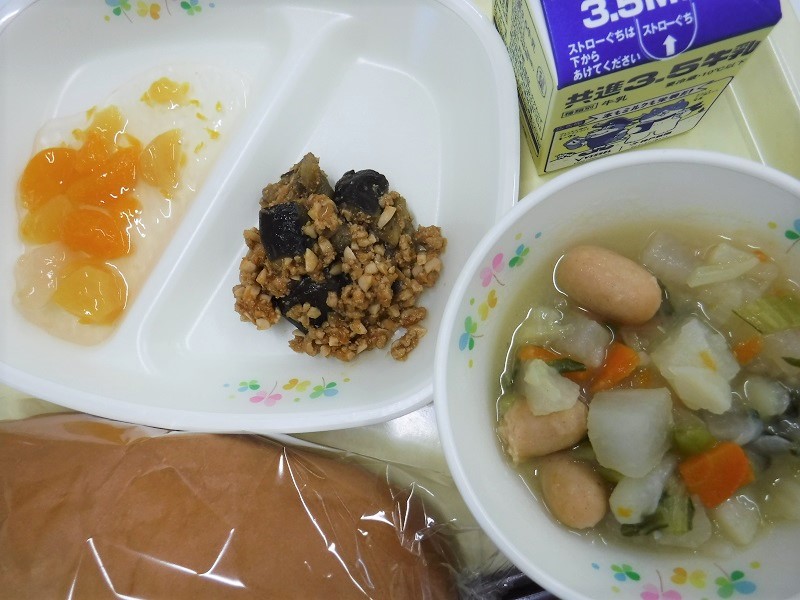 【材料】(1人分g) ☆小学校の分量です 大根 30 人参 10 里芋 20 木綿豆腐 20 生椎茸 7 油揚げ 5 葉ねぎ 5 本みりん 1.2 すりごま 2 太子みそ 10 煮干し 2 【作り方】 1.煮干でだしをとる。 2.大根・人参は短冊切り、里芋は1センチメートル幅の銀杏切り、椎茸は石づきを取って薄切り、ねぎは小口切りにする。油揚げは油抜きし、薄切りにする。豆腐はさいのめに切る。 3.1.に人参・大根・里芋・椎茸・油揚げ・豆腐の順に材料を入れる。 4.野菜に火が通ったら、みそ・みりんを加えて味を調整する。 5.最後にねぎ・すりごまを散らして仕上げる。