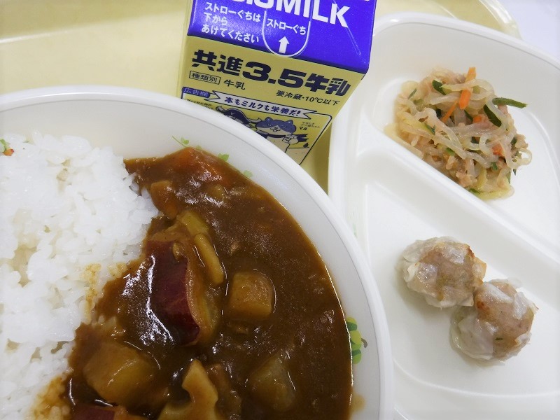 【材料】(1人g)☆小学校の分量です。 豚肉 10 じゃが芋20 玉ねぎ25 人参10 さつま芋20 れんこん13 大根15 まいたけ5 にんにく0.3 生姜0.7 チキンブイヨン(固形)0.9 カレールウ12 ケチャップ3 菜種サラダ油0.2
