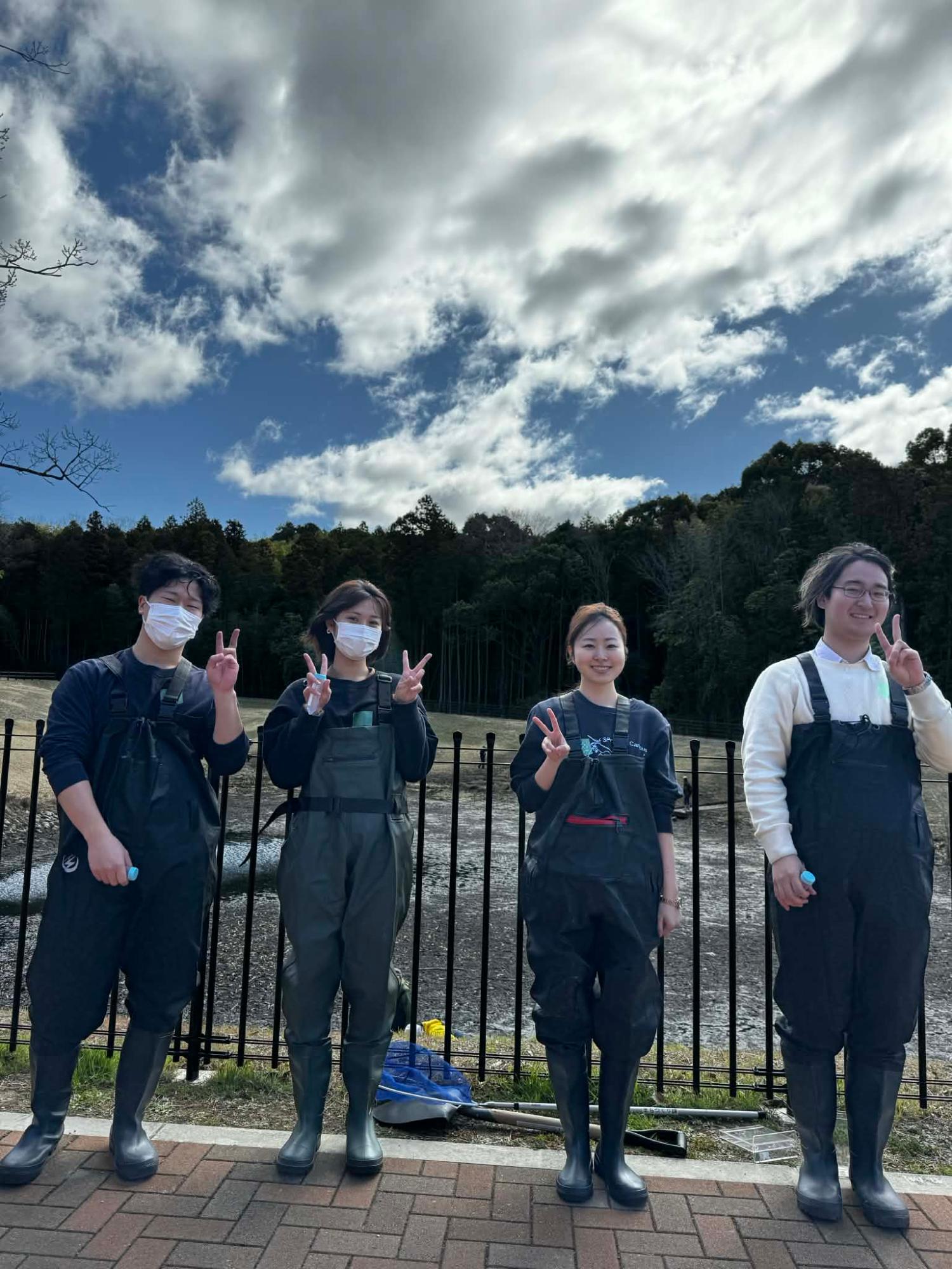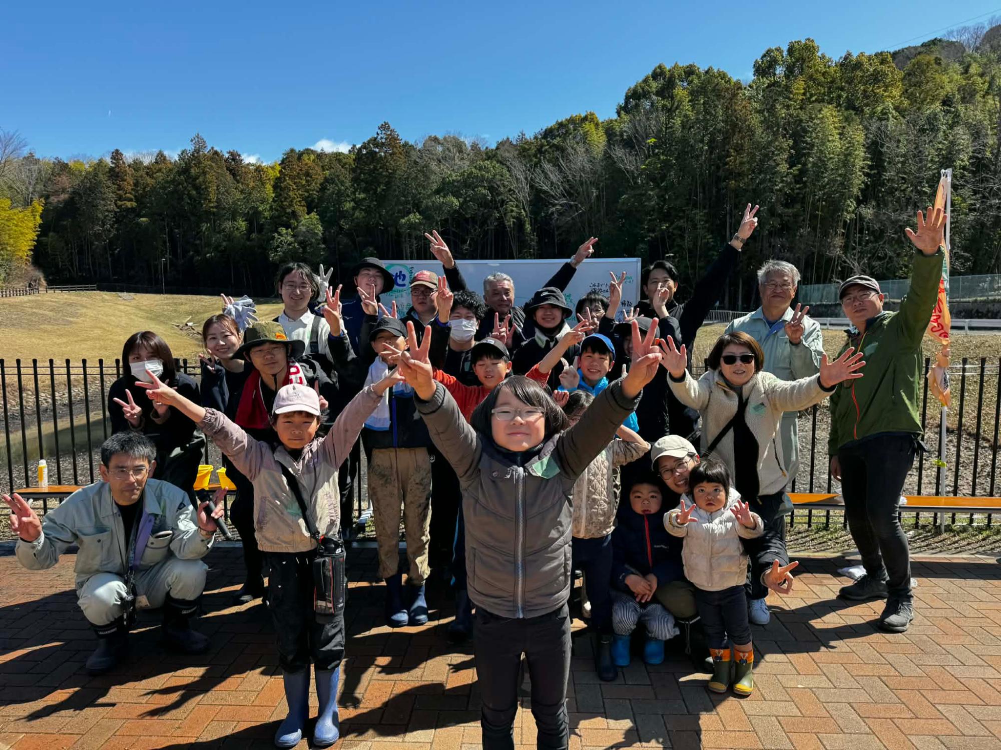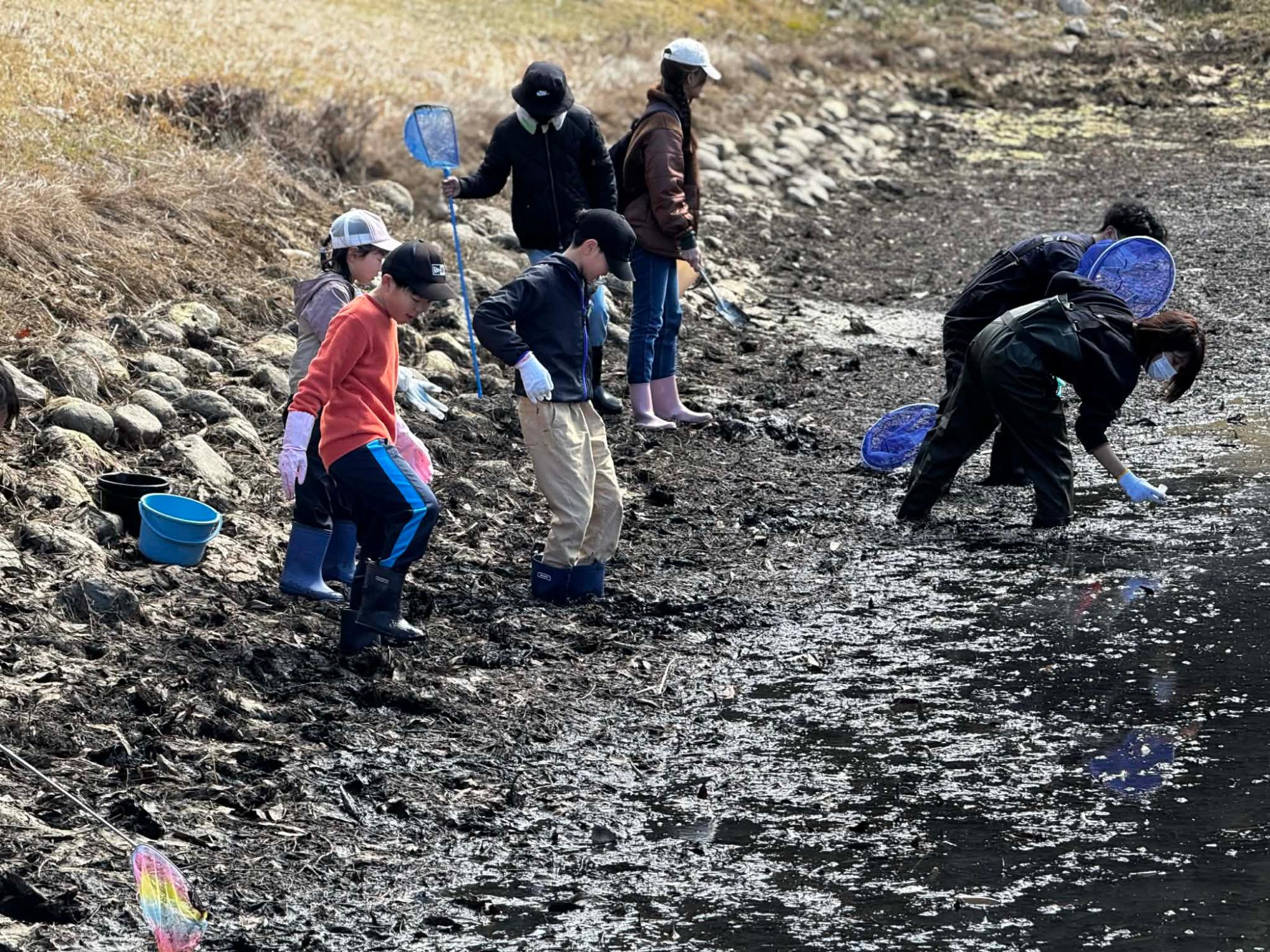 快晴のもと、水位を下げた池に入り、網などを使って水中生物の捕獲・観察を行いました。子どもから大人まで自然に触れながら学べる、充実した時間となりました。普段は見えない池の中の世界に触れ、参加者からは驚きや発見の声があがりました。