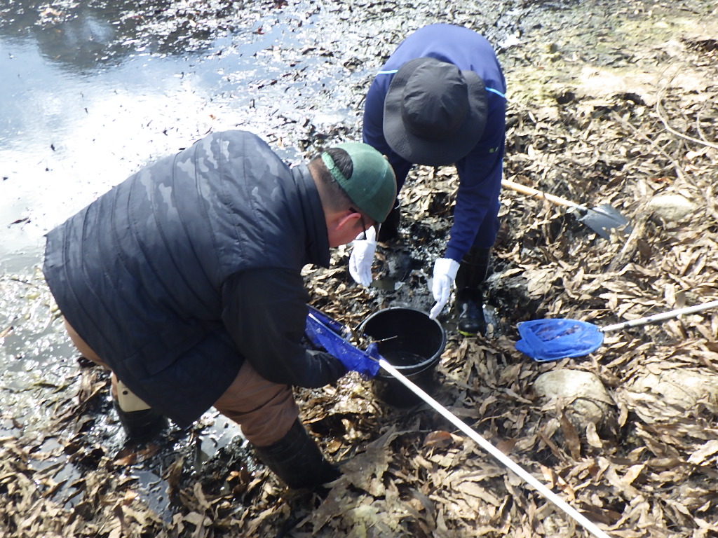 水位を下げた状態の柳池に入り、いきものを捕まえて、どのようないきものが池に住んでいるかを調査します。