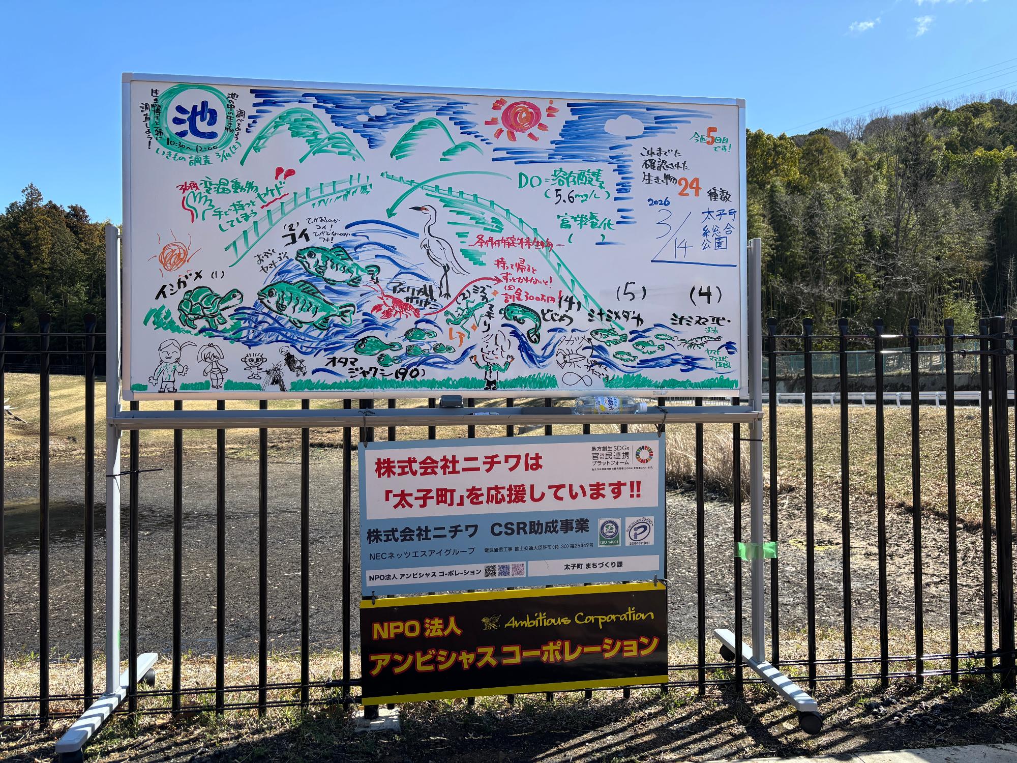 株式会社ニチワCSR助成事業のもと、NPO法人アンビシャスコーポレーション主催により住民や企業、行政などが参加し、公園内の清掃活動を行った後、公園内にある柳池で輪になって乾杯を行いました。