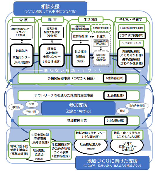 課題の複合化・複雑化の背景には、社会的孤立など関係性の貧困から自己肯定感や自己有用感の低下につながり、自身に課題があるということに気づかないまま支援制度の枠組みからこぼれ落ちることで、病気の悪化や世帯の貧困、虐待やDV、自殺などのリスクに結びつく傾向があり、必要な支援が届かない人や世帯に寄り添い、社会とのつながりを回復する支援を行うため、「アウトリーチ等を通じた継続的支援事業」、「参加支援事業」を実施します。