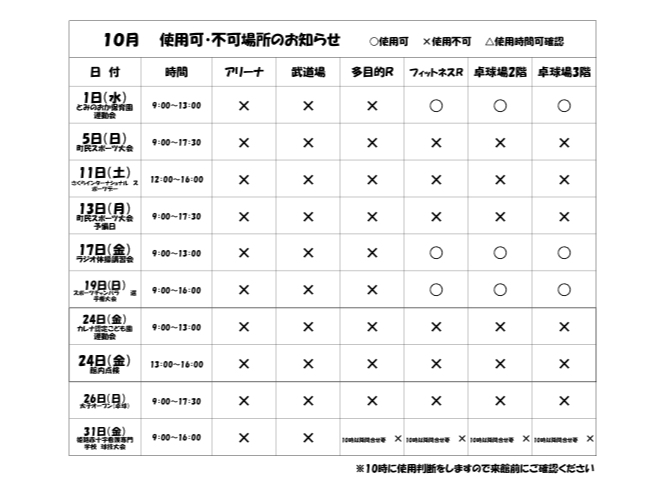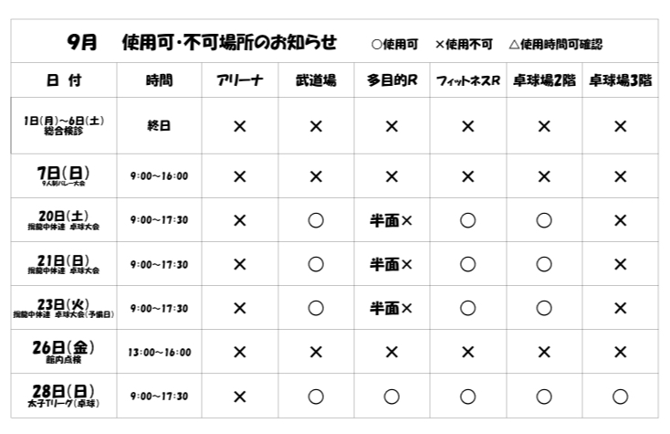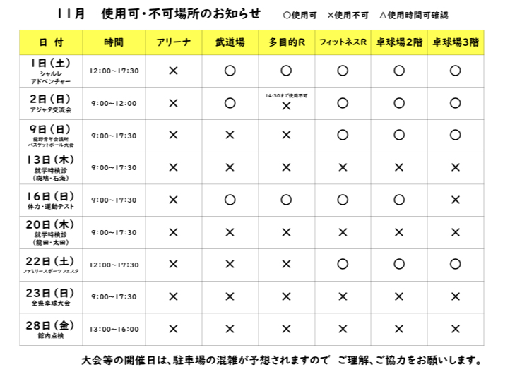 ただし、大会等の行事が早く終了した場合は、使用制限を解除する場合もあります。お気軽に当館までお問い合わせください。