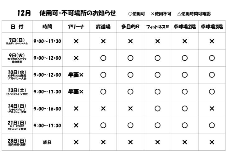 創継町民体育館では開館日であっても、館内点検や大会等の行事によりフィットネスルームや卓球場の使用を制限する場合があります。