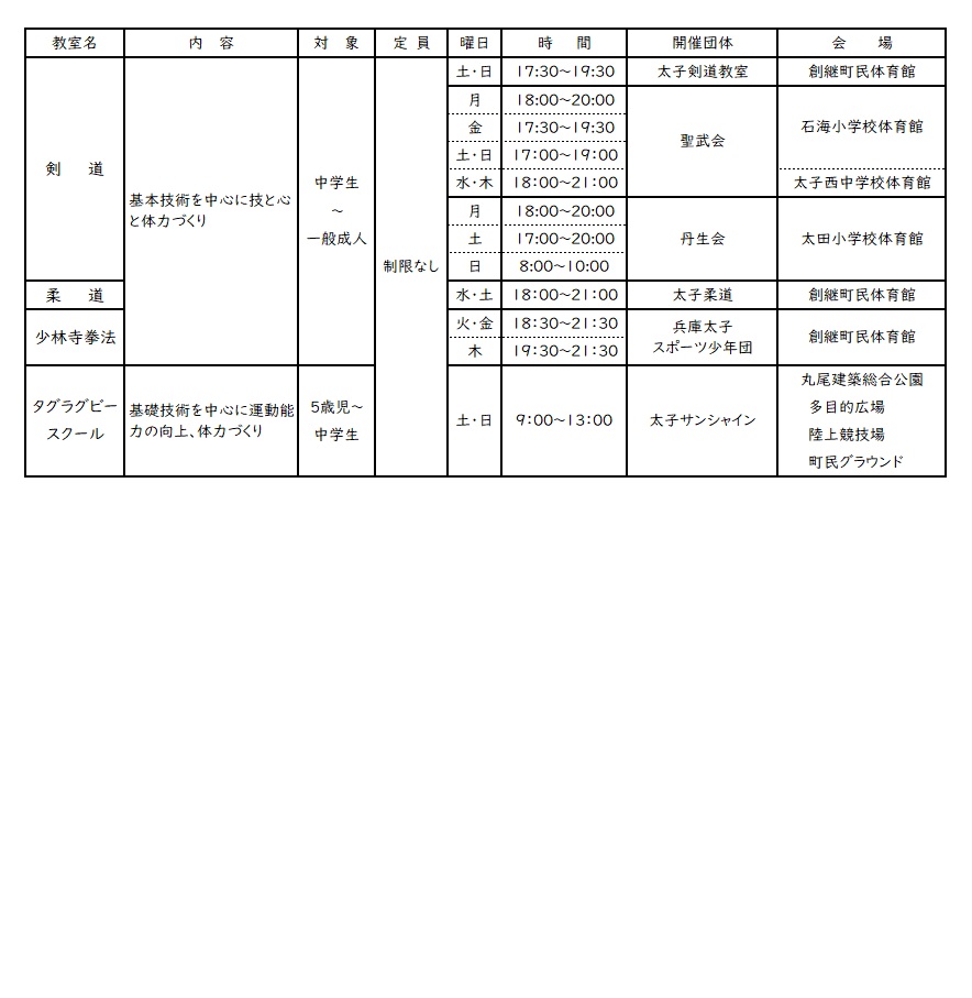 通年教室 対象者 町内在住者(その他詳細は下の表でご確認ください) 申込期間 随時 受講料 各教室により異なりますので受講連絡の際にご確認ください。 申込方法 各教室の連絡先を創継町民体育館で確認のうえ、希望の教室に受講の旨をお伝えください。 開催教室詳細 タグラグビースクールでは新メンバーを募集しています 少林寺拳法教室
