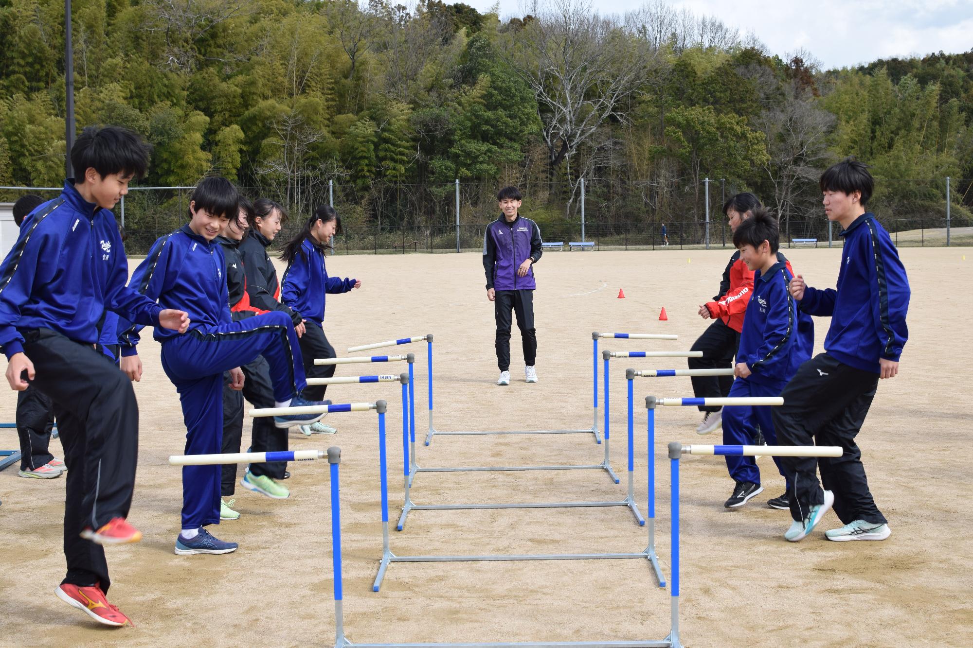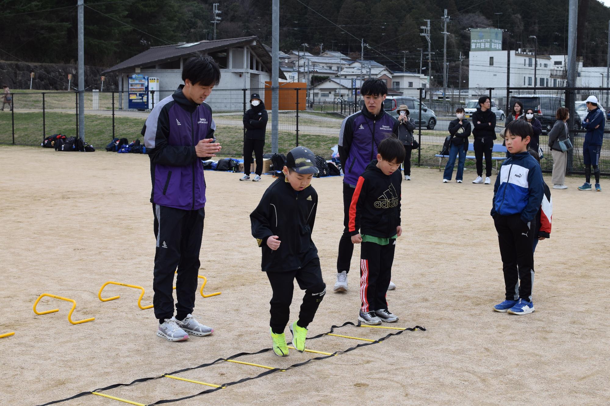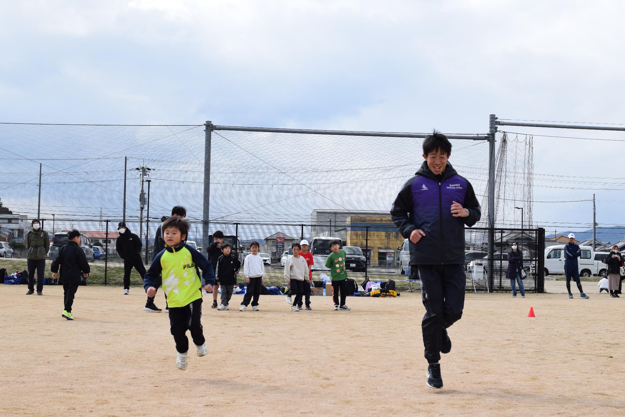 当日は、山陽特殊製鋼陸上競技部の監督・選手8名をお招きし、小学生はランニングにおける基本の動きについて、中学生は短距離、長距離に分かれ専門的な指導していただきました。参加者は、体幹トレーニング、器具を使ったスプリントドリルを通して体の使い方や走り方のこつを学びました。教室の締めくくりには、学年縦割りのチームに山陽特殊製鋼陸上競技部のみなさんも加わっていただき、リレーをしました。